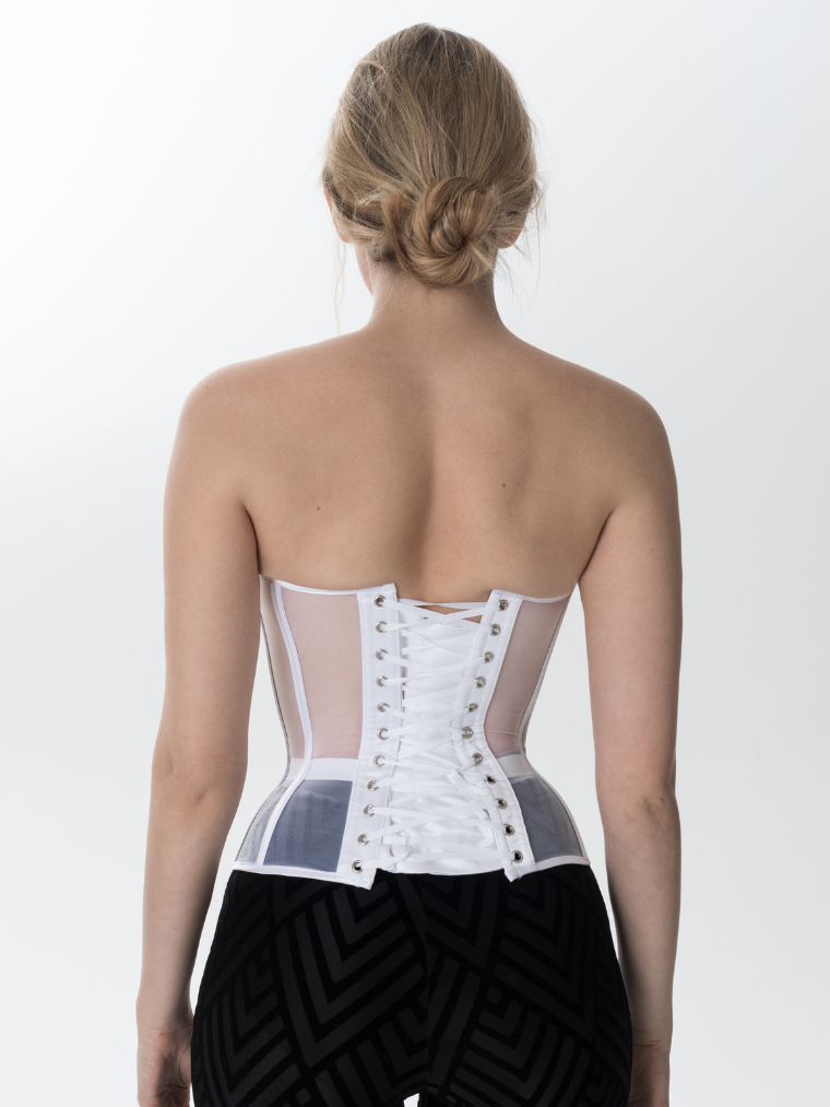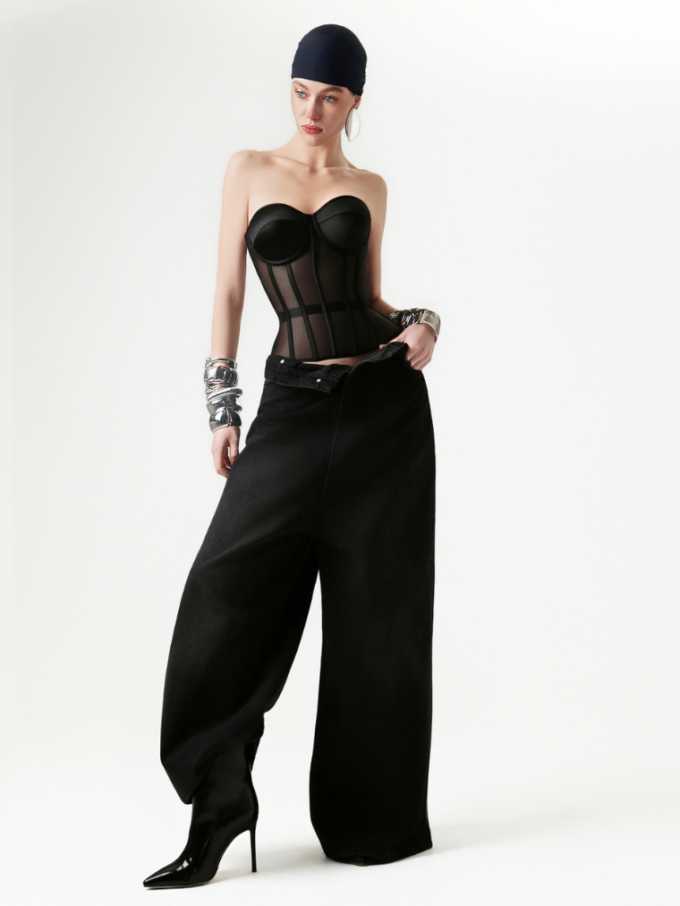 A fashionable woman in a black corset and leather bra poses confidently on a staircase, creating a bold and elegant look.